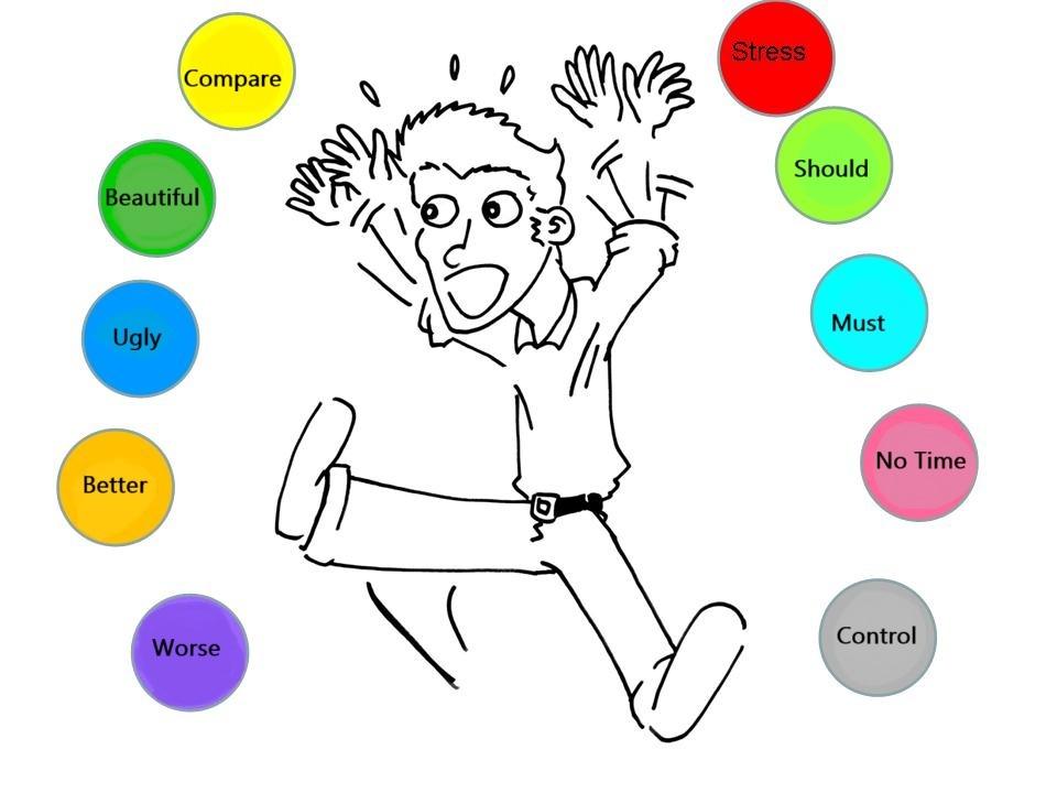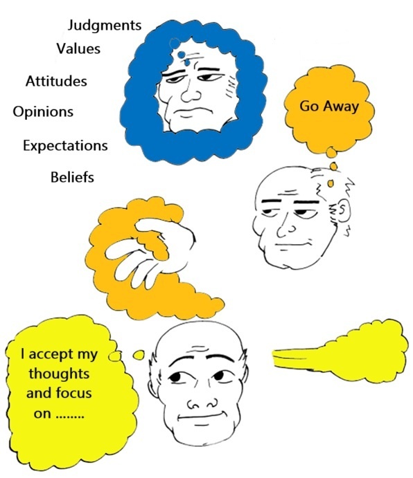 Middle picture. Here we try to get rid of the thoughts and what happens is that they almost certainly come back. "I can't think about a pink elephant" guarantees that we will think about pink elephants.