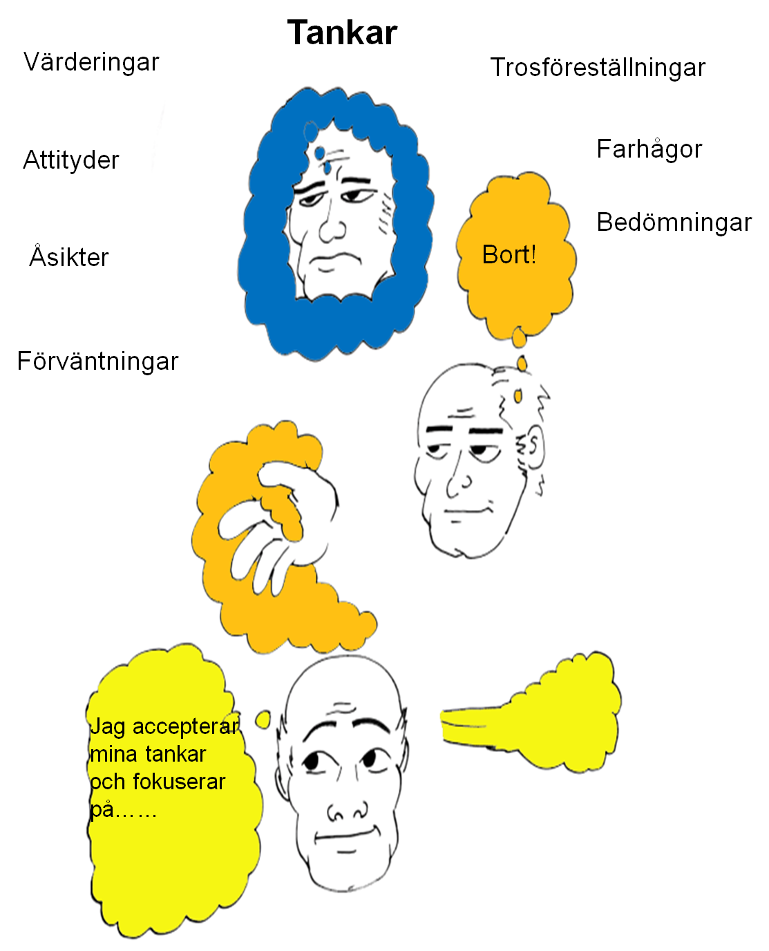 När vi kan acceptera våra negativa tankar och fokusera om till något neutralt så är steget nära till att kunna fokusera på det som är positivt och som bygger och stärker.